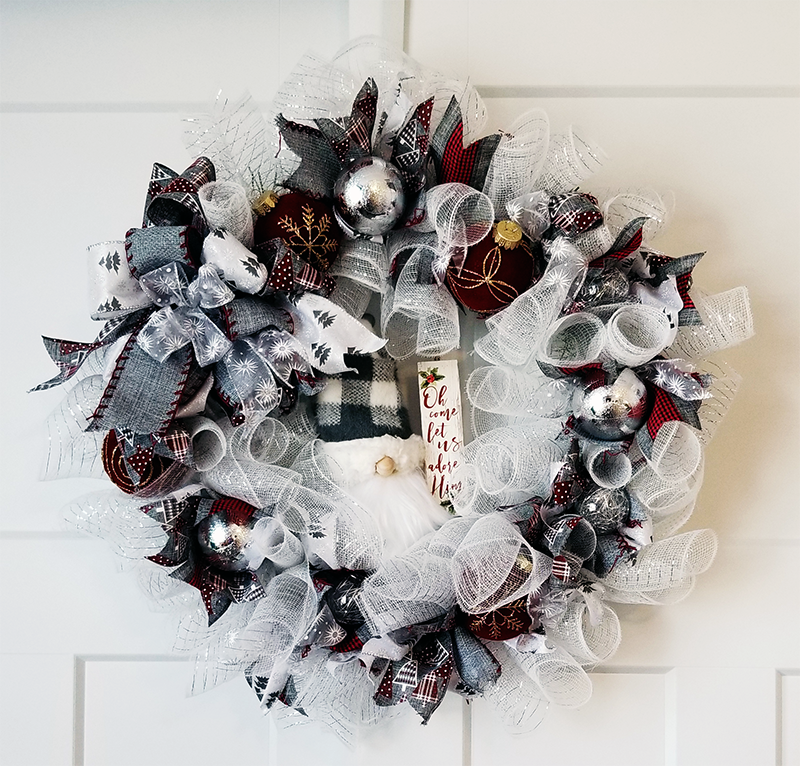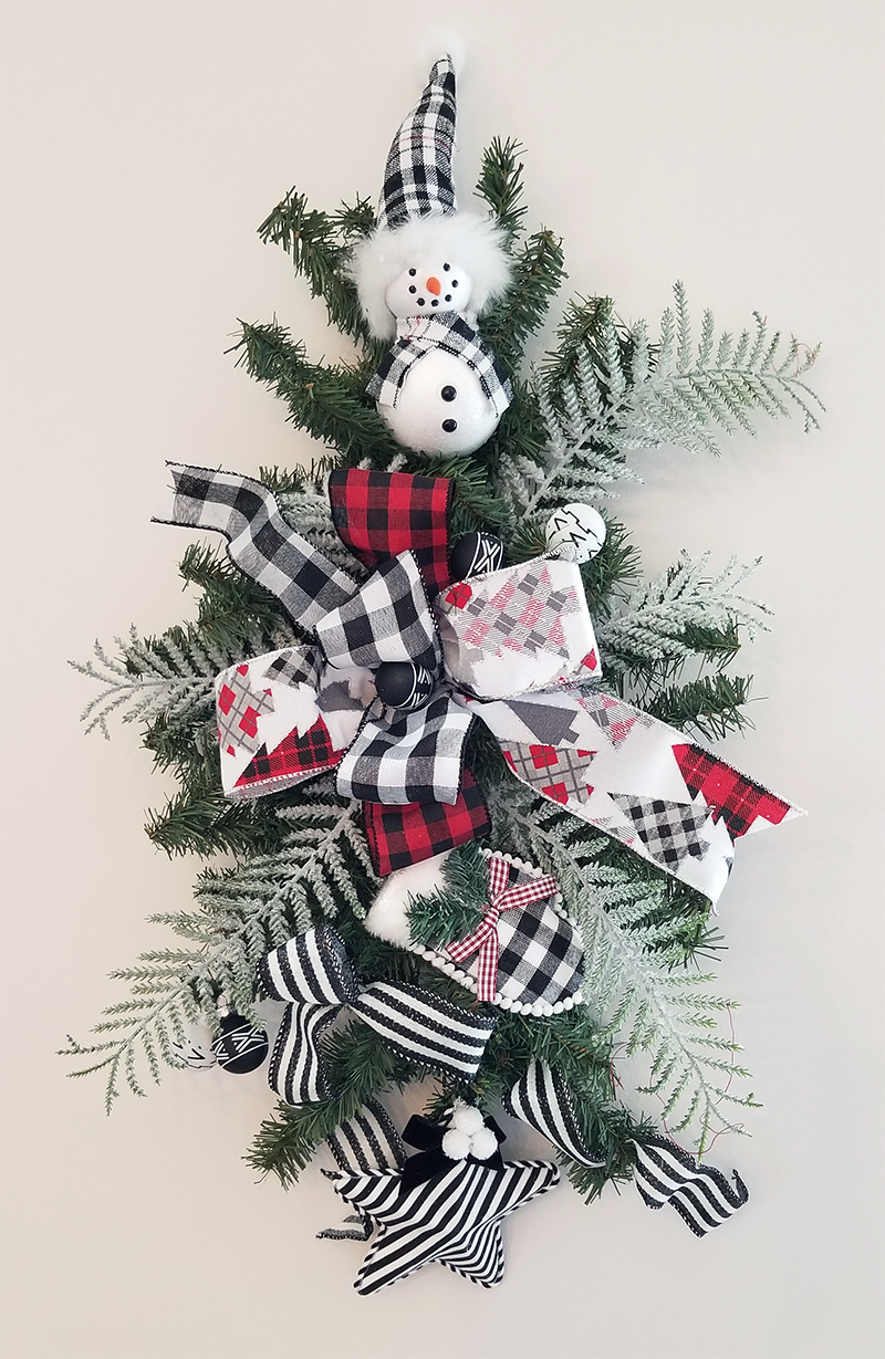 A black and white swag outfitted with buffalo checked ribbon, a five pointed star, and a little greenery. 27" tall. $45