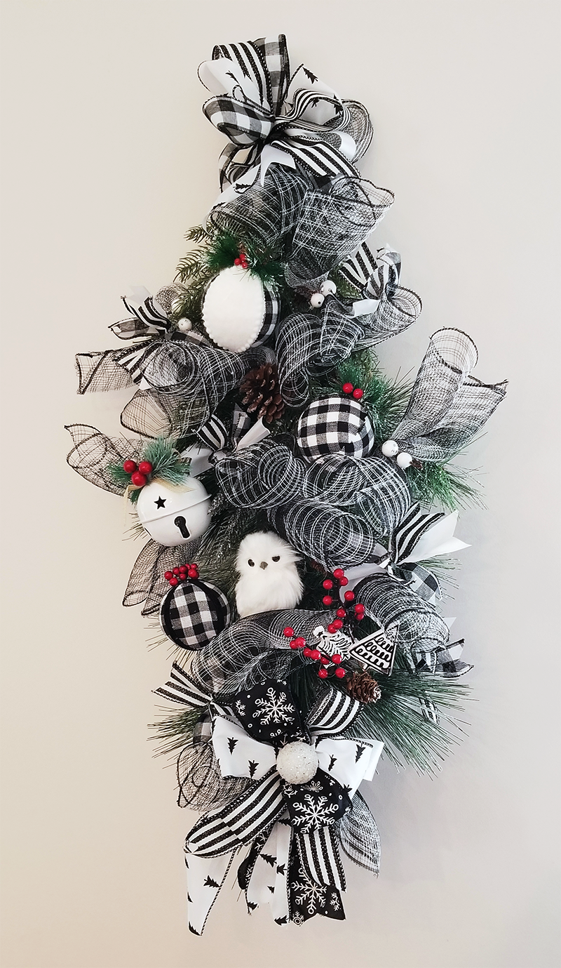 36" tall black and white swag with ornaments, berries, and a cute white owl. $50.
